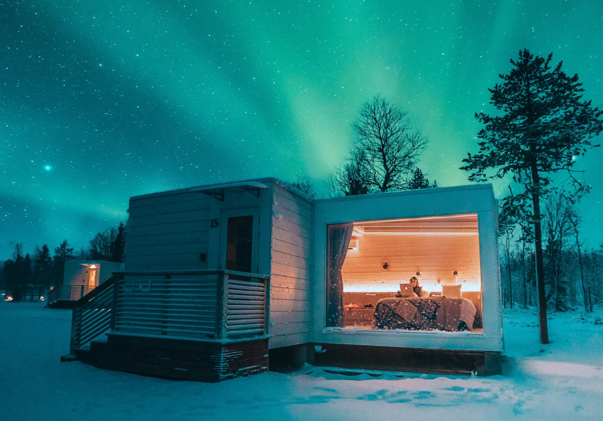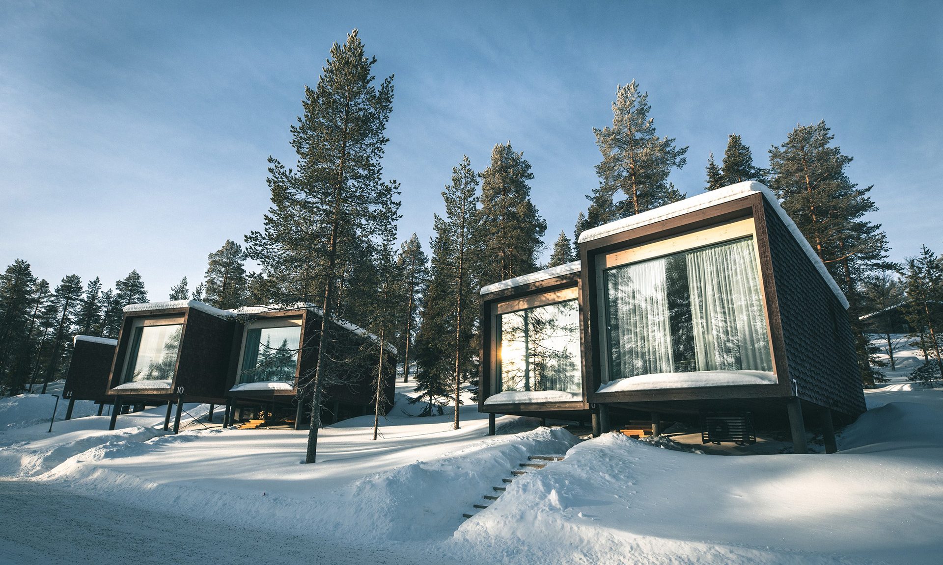 Modern Nordic design meets cozy warmth. Each suite has large windows facing north, perfect for viewing the Northern Lights from the comfort of your bed. The hotel is near Santa Claus Village and Rovaniemi Airport, making it both beautiful and convenient.