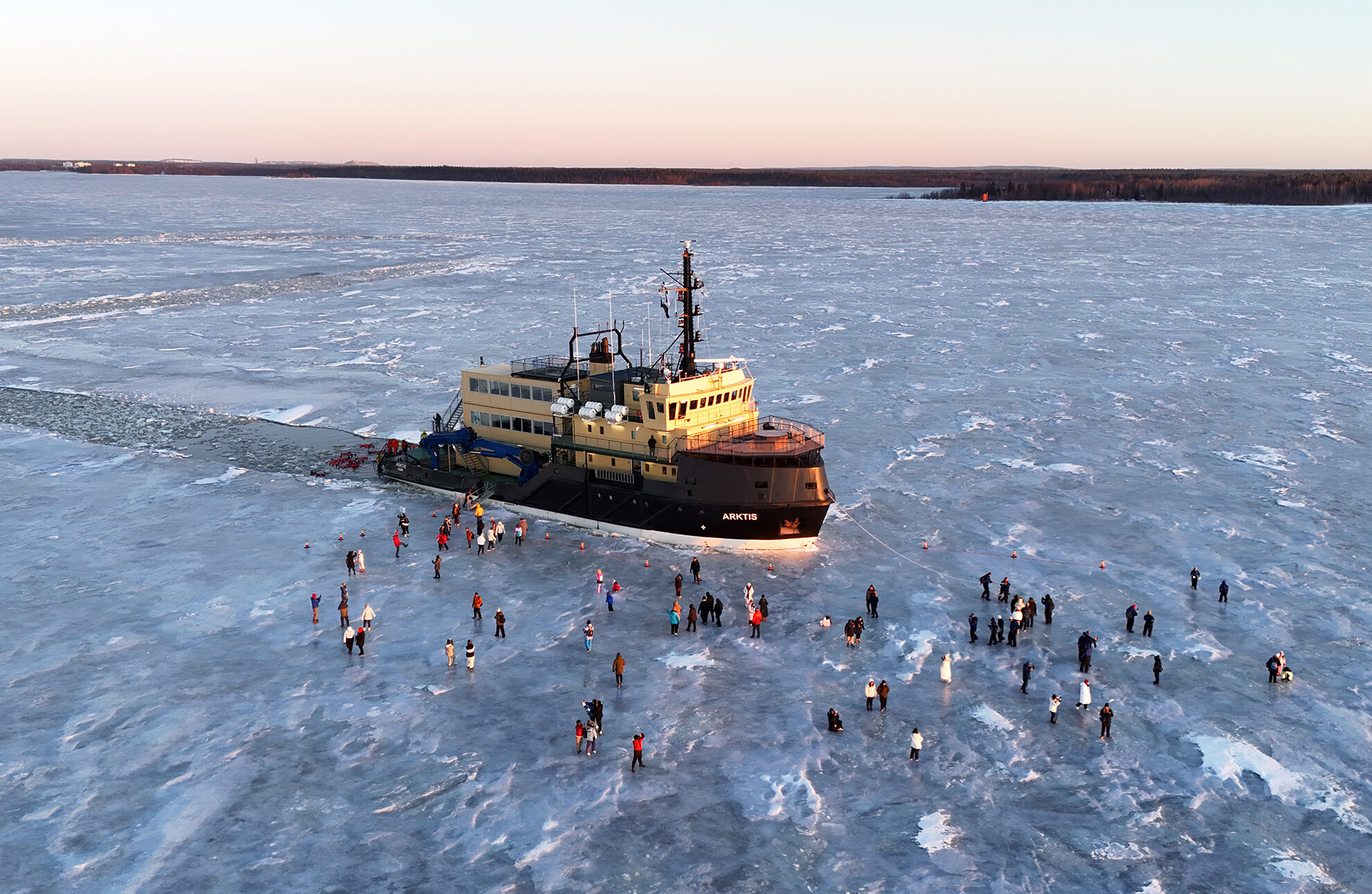 After crossing the Finnish-Swedish border, board the ship and watch it plow through thick sea ice – an amazing sight. Step onto the frozen sea and for a truly unique moment, wear a floating survival suit and float among the icy floes – an unforgettable Arctic memory.