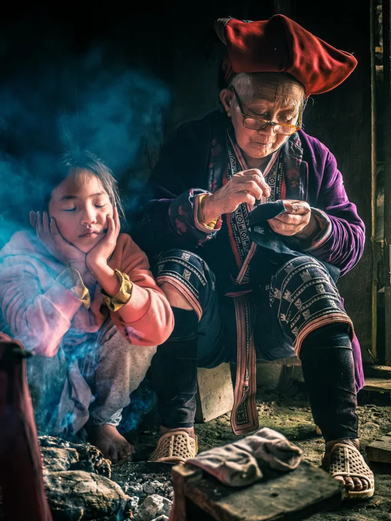The photo was taken in Lào Cai, Vietnam. It shows a Red Dao woman working on embroidery under a small lamp. Her little great-granddaughter sits quietly beside her. The moment is full of love and peace.