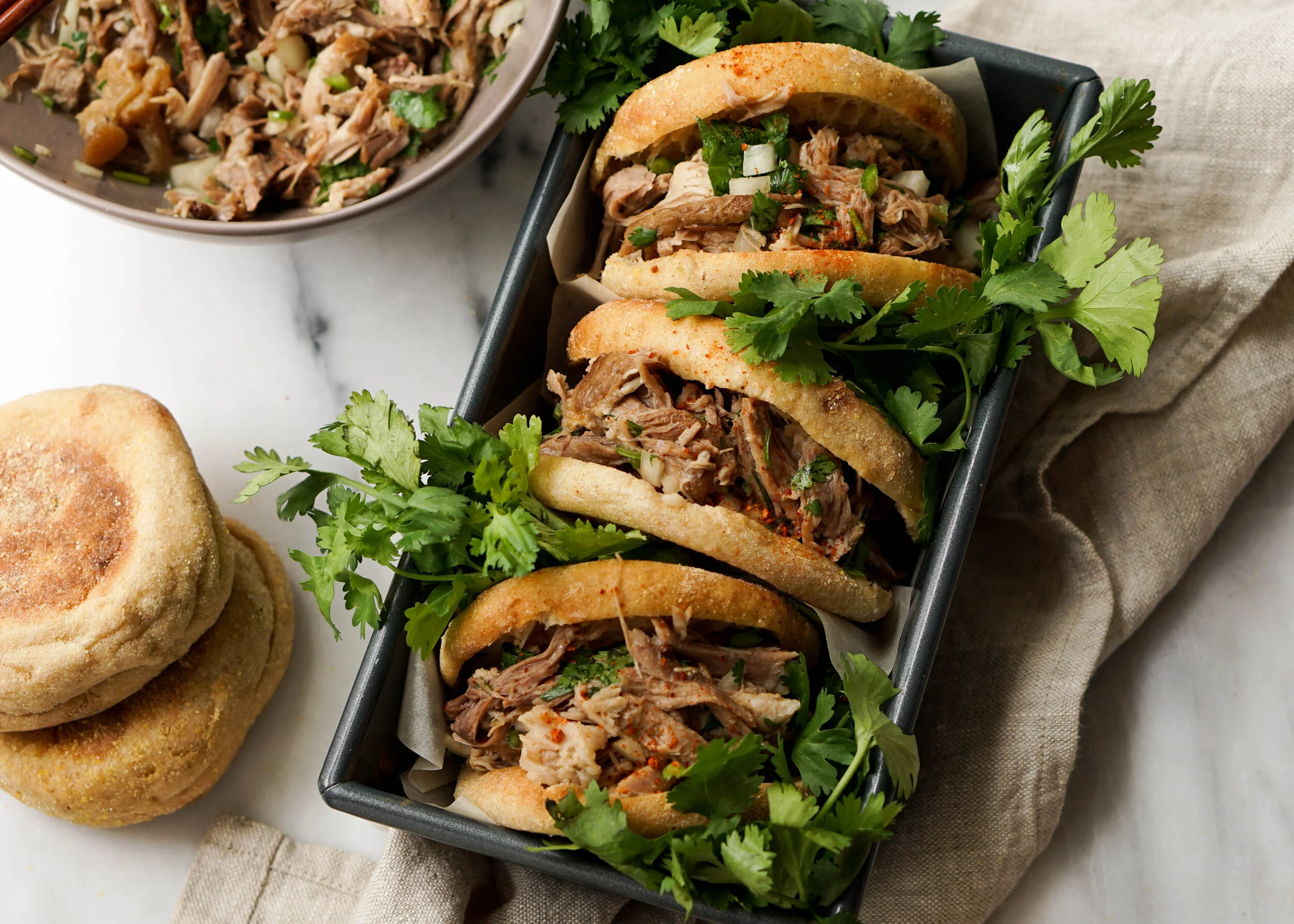 The filling, made from pork, beef, or lamb, is slowly braised in a rich broth with more than 20 spices, then chopped and stuffed into a crispy flatbread – a beloved local street food.